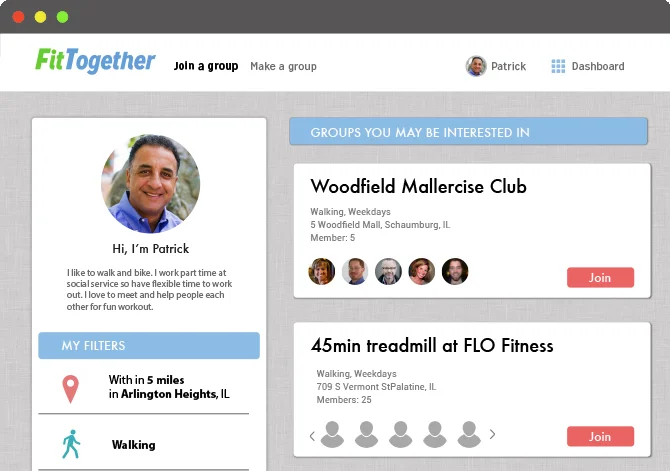 Based on our insights, we created a design concept named Fit Together, helping the elderly find perfect workout groups to make the exercise more fun and effective. Our team focused on providing three key values: facilitating workout with group support, integrating broader healthy behavior into exercise activity, and accelerating workout effect by social goal and advice.
